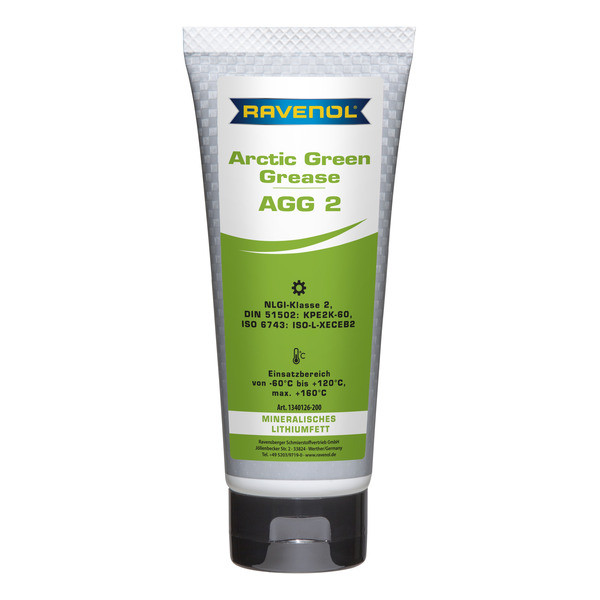 RAVENOL Arctic Green Grease AGG 2 – толугу менен синтетикалык, атайын иштелип чыккан май. Синтетикалык компоненттерге (эстерлерге) негизделип, минералдык май кошулган жана литий самыны менен коюуланган.