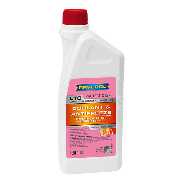 RAVENOL LTC Lobrid Tech. Coolant HOT CLIMATE -15°C is a ready to use, prediluted with water, eco-friendly 1.2- Ethanediol (monoethylene glycol) based coolant for cooling circuits in combustion engines which provides maintenance-free corrosion and frost protection. This product is formulated based on a proven inhibitor development by combining silicates with the organic additive technology OAT as an extended life coolant.