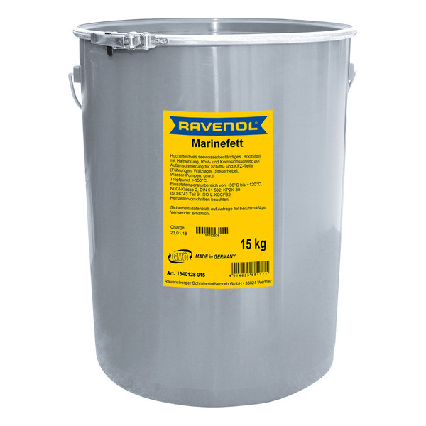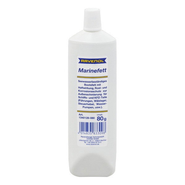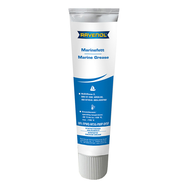 RAVENOL Marinefett – сары-жашыл флуоресценттүү түстөгү, сууга туруктуу деңиз майы. Комплекстүү кальций загустителине, жогорку илешкектүү синтетикалык базалык майга жана кычкылданууга, дат басууга жана коррозияга каршы ишенимдүү коргоону камсыз кылуучу атайын кошумча заттар комплексине негизделип иштелип чыккан.
