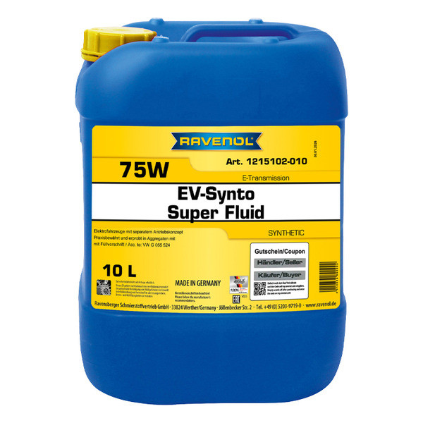 RAVENOL EV-Synto Super Fluid 75W E-TF снижает трение и износ, обеспечивает увеличение срока службы автомобиля. Эффективно смазывает и охлаждает все компоненты трансмиссии электромобилей.